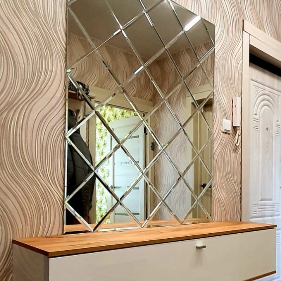 Интересно, что площадь зеркального панно словно бы перечеркнута тумбой, которая крепится к стене. Это запланировано заранее, потому что сделать наугад такое не получится. При этом нижняя часть зеркала, которую вроде бы никто и не видит, добавляет света под тумбой, что будет особенно актуально, когда туда поставят, например, обувь.